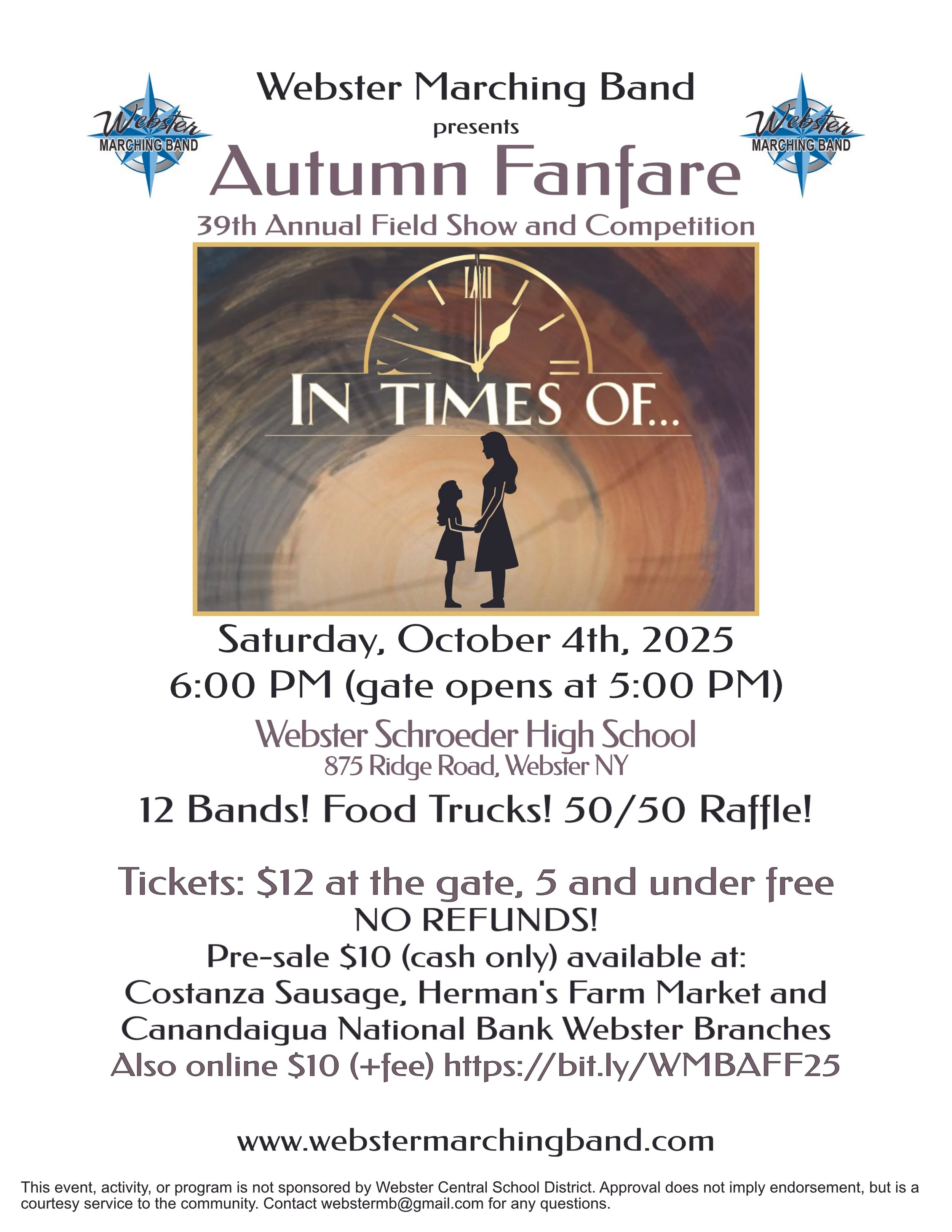 Pre-sale tickets (cash only) are available at: Costanza Sausage, Herman’s Farm Market, Canandaigua National Bank Webster Branches OR online https://bit.ly/WMBAFF25
