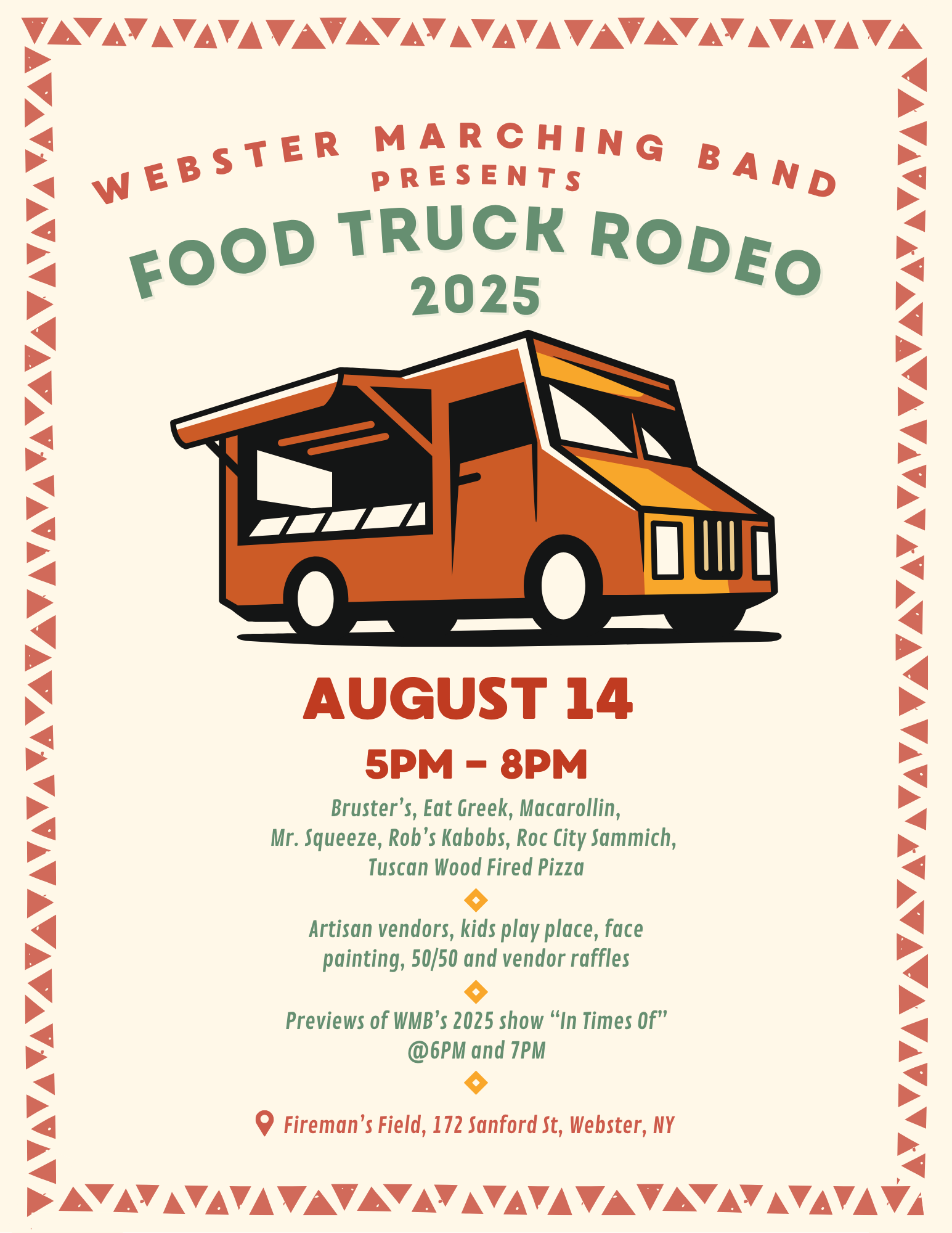 Food Trucks: Bruster’s, Eat Greek, Macarollin, Mr. Squeeze, Rob’s Kabobs, Roc City Sammich, and Tuscan Wood Fired Pizza