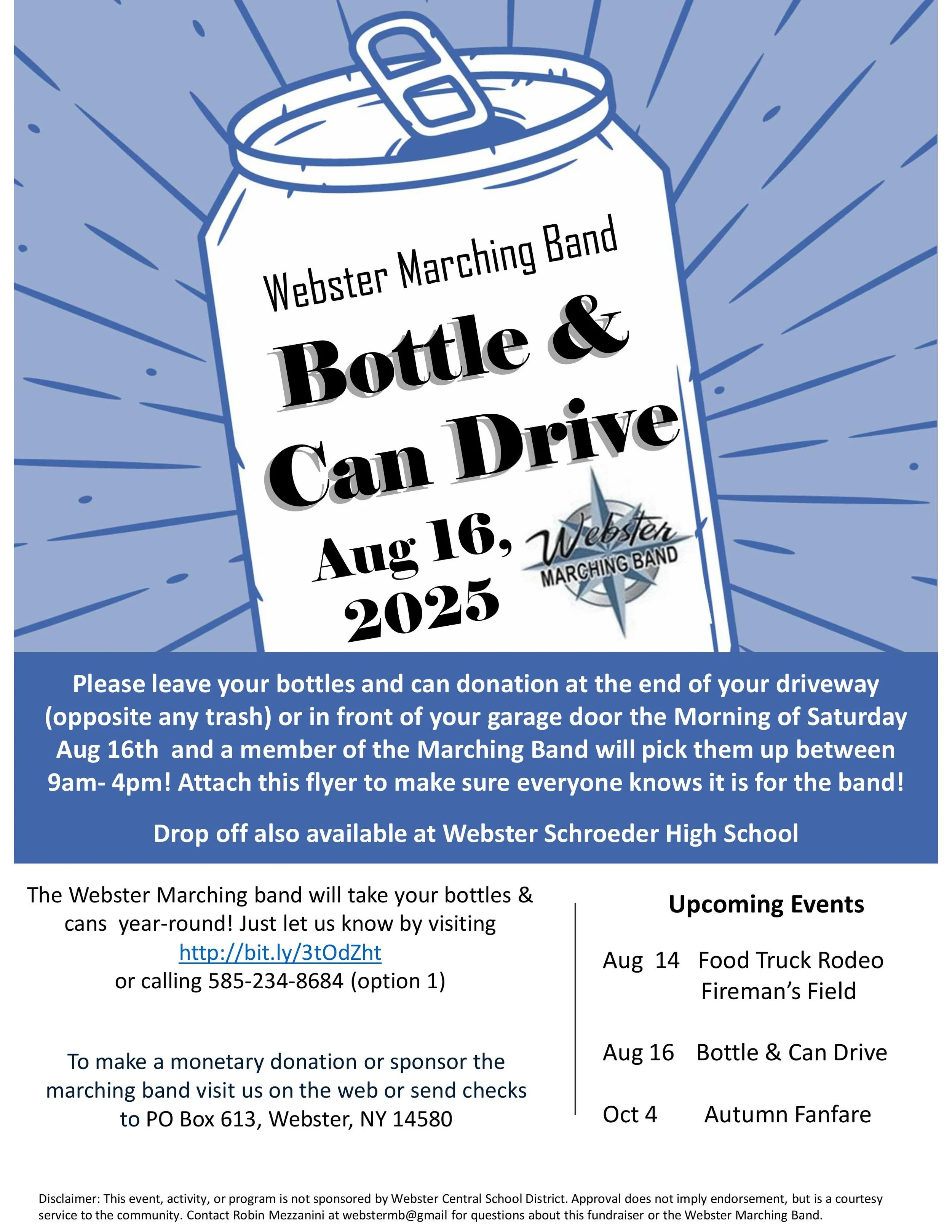 On this day, band student, parents, and volunteers journey across the district to pick-up your bottles and cans! Simply bag your items and leave by the road and someone will scoop it up before the end of the day.